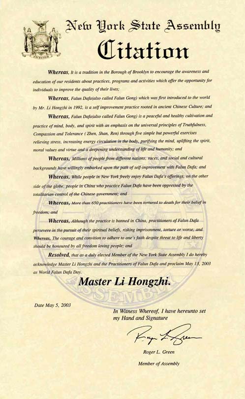 因此,作为纽约州众议院的当选议员,我在此向李洪志大师和法轮大法学员表示谢忱,并宣布2003年5月13日为“世界法轮大法日”。