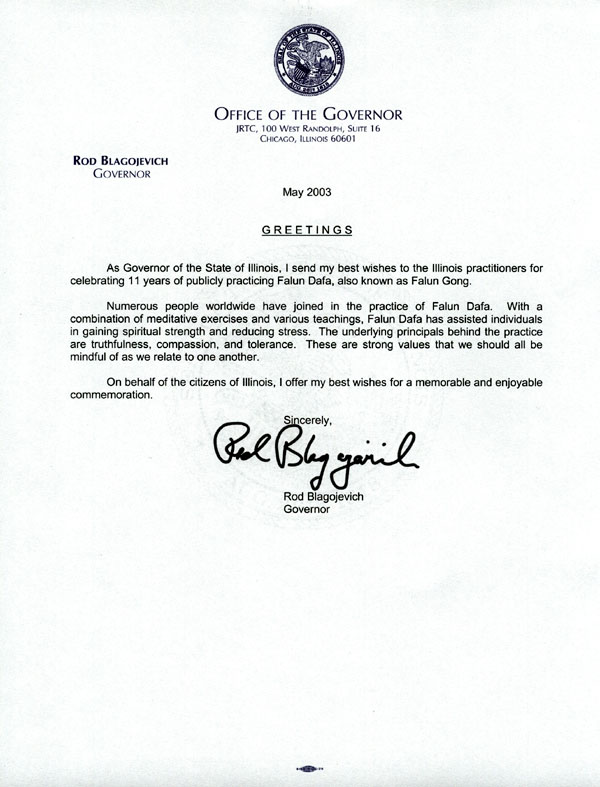 【明慧网2003年5月16日】美国伊利诺州州长罗德-布拉哥介维克向伊利诺州的学员致贺信。