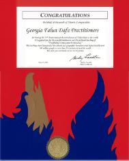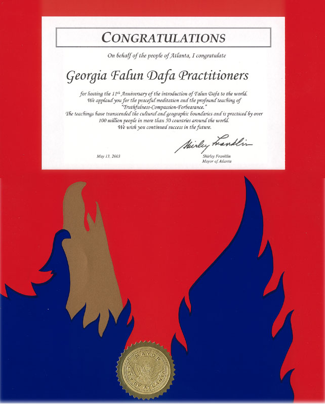 我代表亚特兰大人民向乔治亚州法轮大法学员祝贺法轮大法洪传世界11周年。我们赞赏你们祥和的静坐修炼和精深的真、善、忍理念。法轮大法超越文化和种族的界限,已传至世界50多个国家,有1亿多人在修炼。我们祝你们在今后的日子里继续取得成功。
