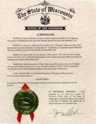 威斯康星州州长 办公室表彰鉴于,法轮大法(又称法轮功)是一种古老的气功,他通过特殊的动功和打坐使身心得到净化,并且,鉴于,在其创始人李洪志先生的教导下,成百上千万的法轮大法修炼者一直在遵循着“真、善、忍”的法理而且身心受益极大,并且,鉴于,法轮大法于1998年传至威斯康星州,自那以后,建立了固定的炼功点,在大学校园和其它公共地方已经举办了上百的免费学习班,并且,鉴于,虽然法轮大法在他的发源地中国仍在遭受迫害,但在过去的10年里在世界60个国家已经有上亿人在修炼法轮大法,这包括威斯康星州的居民,因此,现在,我,吉姆.多利(Jim Doylr),威斯康星州州长,特此表彰:法轮大法并且鼓励所有的居民更多地了解这一功法。