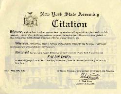 纽约州众议院嘉奖状鉴于,一个伟大的州之所以伟大是因为她拥有那些对社区作出杰出贡献的伟大的社团,不论是参加义务活动,还是在精神或其他领域做出了独特的成绩,或者仅仅是倡导做好公民的生活方式;而且鉴于,这些贡献的的确确是本社区和本州生活的血液,可是却往往被人忽略,没有得到应有的嘉奖;因此现在决定作为正式选举出来的纽约州众议院议员,我表彰:法轮大法我们拥有这样一个杰出的团体,一个值得社会及大纽约州尊敬的团体。