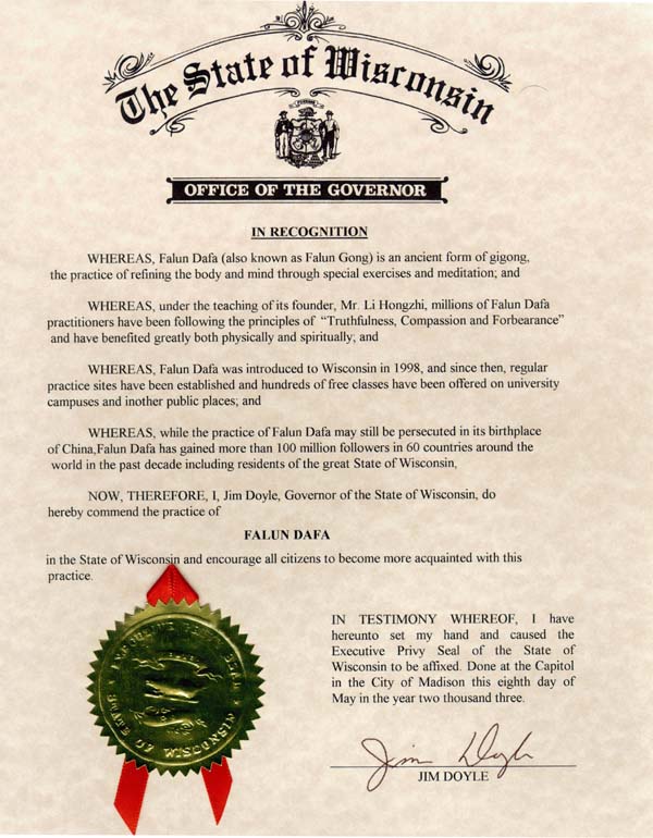 鉴于,虽然法轮大法在他的发源地中国仍在遭受迫害,但在过去的10年里在世界60个国家已经有上亿人在修炼法轮大法,这包括威斯康星州的居民,