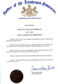 宾西法尼亚副州长办公室褒奖庆祝世界法轮大法日2003年5月13日“真、善、忍”鉴于今天是法轮大法在宾州传授给大众的第11年;鉴于在五月我们认可法轮大法的益处,法轮大法是一种传统的自我提高的功法,倡导身、心、灵的提升;鉴于宾州很多公民修炼法轮大法,并以真善忍原则作指导;鉴于法轮大法超越文化、社会、经济和国家界限;因此,我代表所有宾州人在这个特殊的日子里向你们表达我最美好的祝愿。