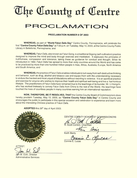 鉴于,作为“世界法轮大法日”庆祝活动的一部分,宾夕法尼亚州森特县将于2003年5月13日星期二晚上七点在位于宾州百乐方特市的森特县公共图书馆庆祝第一届“森特县法轮大法日”;并且