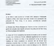 2003年4月30日致:法国法轮功协会主席先生:我读了您于2003年4月12日寄给奥地利驻巴黎大使馆的信,信中您提到法轮功学员被迫害的情况。