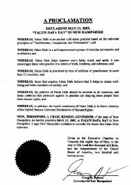嘉奖令宣布5月13日为新罕布什尔州法轮大法日 鉴于,法轮大法是以宇宙特性真、善、忍为基础的古老修炼系统;并且鉴于,法轮大法是一个自我完善的锻炼和打坐体系;并且鉴于,法轮大法帮助改善人们的身心和精神;同时也鼓励修炼者遵循真、善、忍法理;并且鉴于,在超过55个国家里有成千上百万人修炼法轮大法;并且鉴于,修炼法轮大法的人们相信法轮大法能带来幸福,并使人变成社会中更好的一员;并且鉴于,所有国家都应当允许人们修炼法轮大法,迫害法轮大法的国家是在剥夺人们的基本人权;并且鉴于,对法轮大法的野蛮镇压直接违犯联合国全球人权宣言;因此,我,克雷格-本森(Craig Benson),以新罕布什尔州州长的名义,在此宣布2003年5月13日为新罕布什尔州“法轮大法日”,并敦促所有新罕布什尔州居民思考法轮大法信奉的原则。