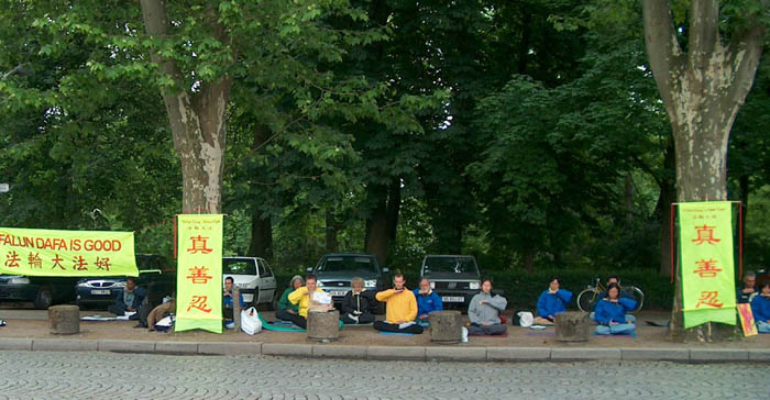 二零零三年五月十五日,大法弟子于早上十点抵达目的地后,便挂上德文及英文的横幅,展现法轮大法好和揭露大法弟子在中国所遭受的残酷迫害。大法弟子们有条不紊地炼功,发正念和向路人发传单讲真相。请愿活动直到下午六点才结束。现场气氛非常融洽祥和,两千多份资料被分发一空。