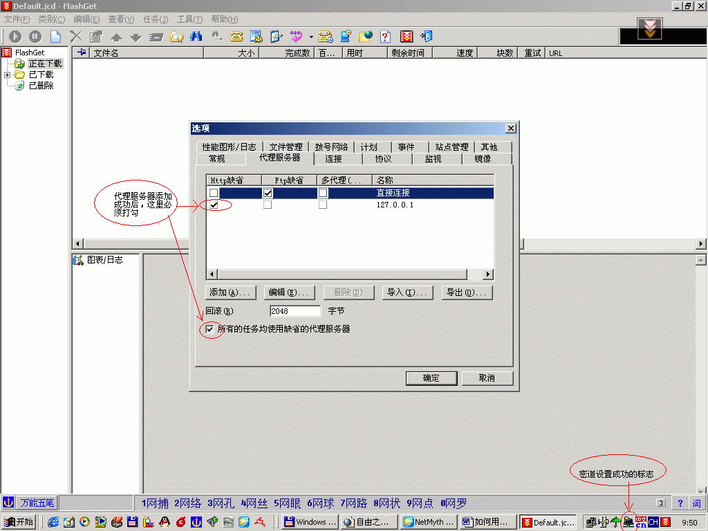 3、打开网际快车,点“工具”-->“选项”-->“代理服务器”-->“添加”-->“名称”随便填,“服务器”填127.0.0.1,“端口”填8081,选中HTTP,按“确定”-->回到上一个画面,在“Http缺省”勾选上127.0.0.1,勾上“所有任务均使用缺省代理”按“确定”。这样设置完成后,就可以用网际快车下载了。(笔者在WIN2000下可以成功使用。)如图: