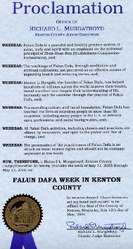 肯顿郡首席长官理查德.L.默格特办公室褒奖公告肯顿郡法轮大法周 鉴于,法轮大法是一套和平健康的身心修炼系统,重在修炼宇宙原理真、善、忍,而且; 鉴于,法轮大法的法理,通过静坐和精神修炼的方式,被视为是一种改善健康及缓解压力的有效方法,而且;鉴于,法轮大法的创始人李洪志大师帮助全世界数以千万计的人们通过修炼法轮大法从而改善健康,提升道德水准,加深对生活、人性和宇宙的理解,而且; 鉴于,法轮大法超越文化和种族的界限,触及到超过30多个国家中无数不同年龄、职业和种族背景的人们的生活,包括许多美国人,而且; 鉴于,法轮大法的所有活动包括讲座和炼功都由志愿者提供,面向大众,费用全免,而且;鉴于,对法轮大法学员的迫害是对基本人权的践踏,是不能被世界任何地方所容忍的。
