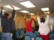 博览会期间,我们有一个小时的讲座时间。尽管我们的讲座安排的时间比较早,但仍然有许多观众早早就来到小讲演厅。一位大法弟子首先对法轮大法的特点、功理和发展史作了简要的介绍,并强调了法轮大法对于提高修炼者的身心健康和社会道德所具有的特殊效果。随后我们又播放了一部介绍法轮大法的短片,让大家对大法有了进一步的认识。接下来是集体教功。由于时间有限,只教了前三套功法。但大家都学得非常认真,力求做好每一个动作,并细细体会大法的精妙。