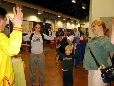 有一个五岁的小男孩经过我们的展台,很是好奇,目不转睛地盯着正在炼功的大法弟子看。当大法弟子问他想不想学时,他欣然同意,并把他的妈妈和姑姑也拉过来一起学。别看他人小,做起动作来有板有眼,很是认真。这一场面也吸引了很多周围展位的展览者,他们也跟着比划起来。