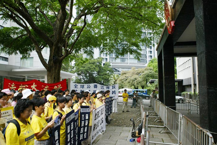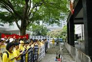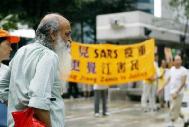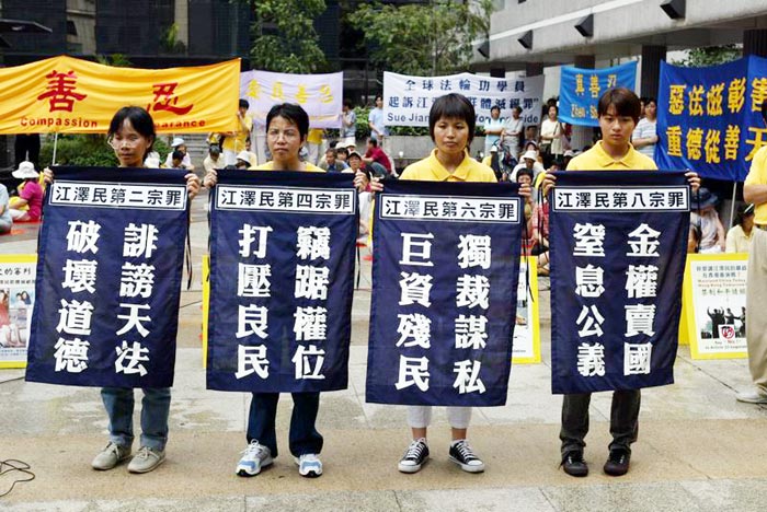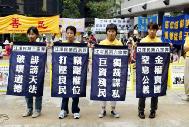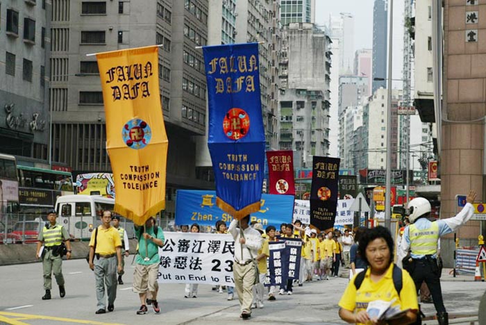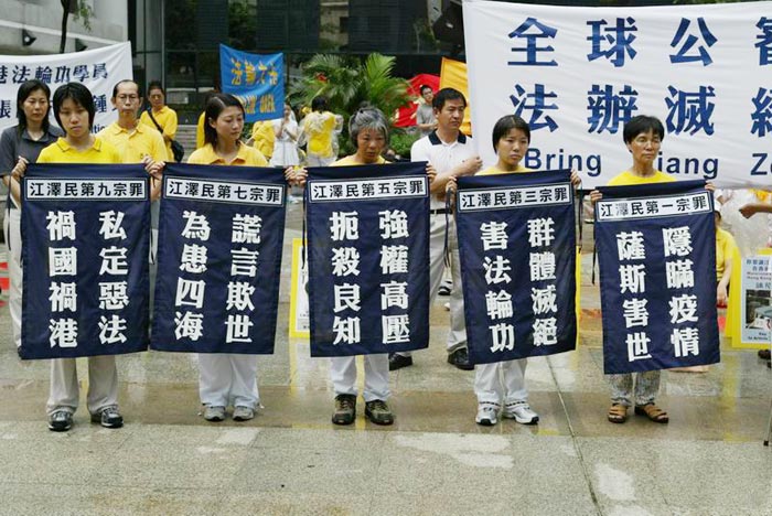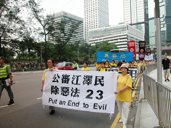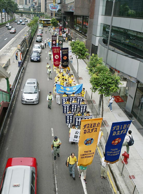 【明慧网二零零三年五月二十六日】「全球公审江泽民,法办灭绝罪元凶」、「捍卫天赋人权,不容恶法祸港」。5月25日,近二百名香港法轮功学员,浩浩荡荡的拉起横幅,由湾仔游行到中环政府总部,向全港市民宣布中国前国家主席江泽民所犯下残暴不仁的「九宗罪」,以及海外法轮功学员正以「群体灭绝罪」把江泽民推上美国联邦法庭的消息。法轮功学员相信「世上所有善良的人们都会从这场全球正义大公审中深深受益」。