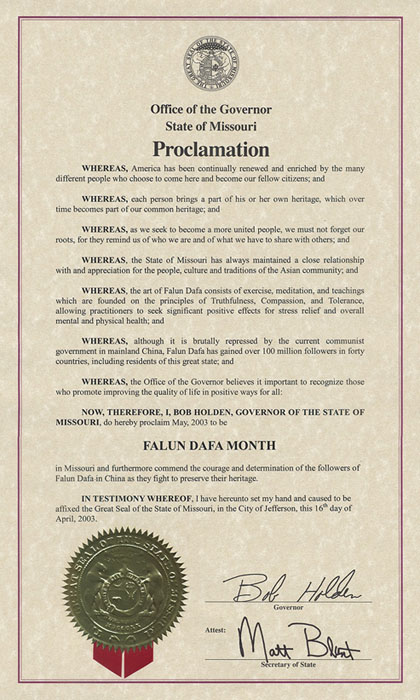 鉴于,尽管法轮大法在中国大陆受到现任中共政府[江氏集团]的残酷迫害,但却在四十多个国家中拥有一亿多修炼者,其中包括密苏里州的居民;并且,