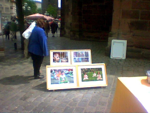 星期五,我们展出了用于图片展的部分图片。图片展示出了和平的法轮大法修炼者和残酷镇压,二者形成了鲜明的对比。同时我们也看到了人们对此的反应。