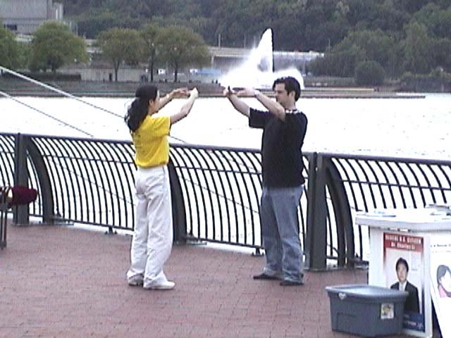 一对年轻人在河边骑车锻炼,他们停下来听我们讲真相,对法轮功被迫害表示震惊和同情,他们签完字离开一段时间后又返回来希望得到更详细的资料和我们平时的炼功时间地点。女青年告诉学员,她是专门画肖像的画家。希望以后在我们炼功时为我们画像以便让更多的人知道法轮大法。