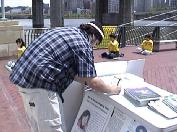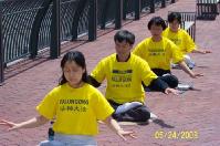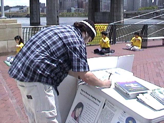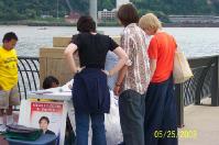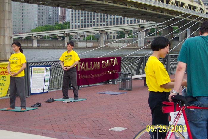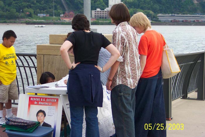 【明慧网2003年5月29日】2003年5月24日和25日是难得的一个长周末,美国宾州匹兹堡市的河边公园(River Front Park) 附近人来人往、喜气洋洋。不远处正在举行着大型活动:民间节(Folk Festival) 、棒球赛。河边附近的“科学中心展览馆” (Science Center)迎来了一批一批参观者。匹兹堡法轮大法学员也来到了河边公园。他们是为营救美国公民、法轮功学员李祥春医生和费城医生杨景端先生的姐姐、法轮功学员杨景芳女士而来到这里洪法、征签的。