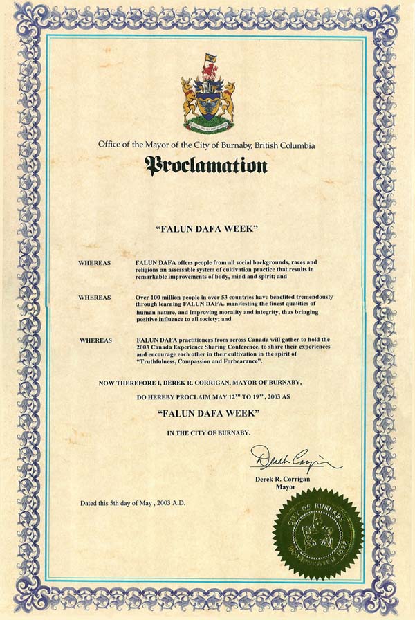 鉴此,我,迪瑞克.科黎根(Derek R. Corrigan),本拿比市市长,宣布2003年5月12日至19日为本拿比市