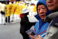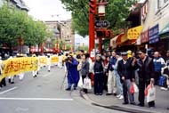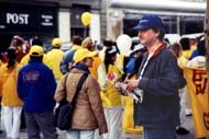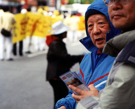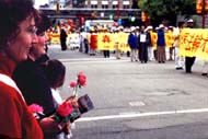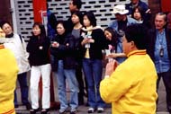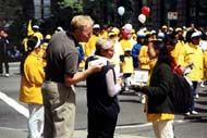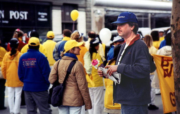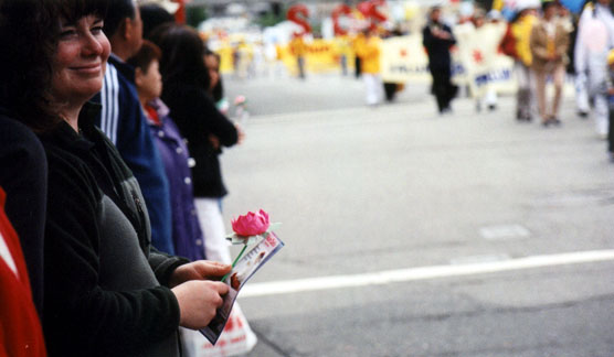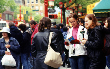 “他们是谁?”“法轮功!”“法轮功?这就是法轮功!”“真漂亮呀!法轮功,真行呀!”“给我一张传单,行吗?”这样的相遇,可能就是佛家所非常看重的“缘份”吧。被打动的人们,非常礼貌地询问着自己内心的疑惑,关于法轮功的谎言太多了,普通人被欺骗的时间也太长了。喜欢思索的人们,或多或少地都会询问自己:“他们到底是为了什么?”“法轮功又为了什么?”…… ……,内心深处已被尘封良久的善念,醒了。