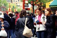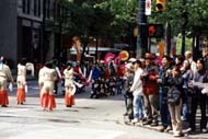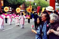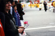 游行的队伍,走过了大街小巷,不期而遇的人们驻足观望。当人们的内心被真诚所感染时,善良从内心中被唤醒时,我们都能感受那份真情的存在。 “真 善 忍”的红色灯笼,表达了法轮大法修炼者内心的境界;手工做出的圣洁的莲花,代表着他们的真诚。雍容绚丽的唐朝服饰,展示着她们的美好风范。他们对世人没有任何索取,他们只希望大家都尊重这份圣洁,把握这份不期之缘。