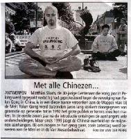 比利时安特卫普报5月10日报导,根特市民马地亚斯-斯拉茨曾于2002年因抗议对法轮功群众的迫害而在中国被捕。他今天也来到安特卫普与其他法轮功修炼者一起在“德美尔”和“德范维生贝克街”两个地方向人们展示功法。