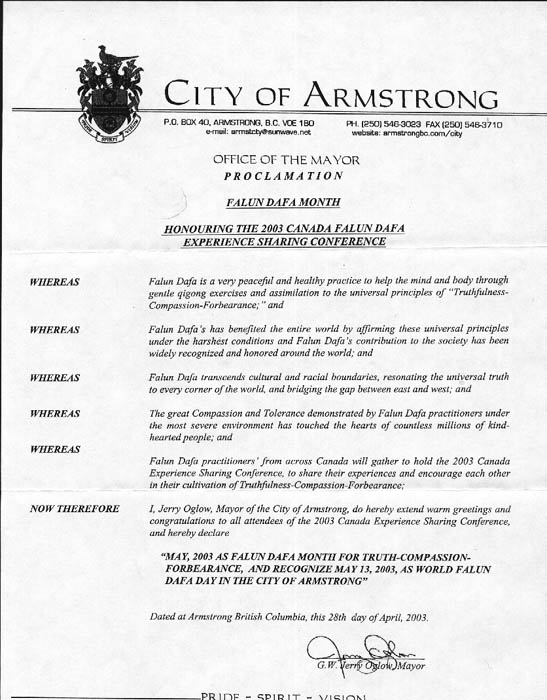 因此,我,阿姆斯壮市市长杰瑞-奥格罗,向所有2003年法轮大法心得交流会的参加者致以热情的问候和祝贺,并特此宣布