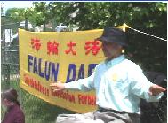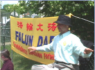 | 四岁小弟子打坐炼功 | 西方学员顶着烈日不停地演示功法 |