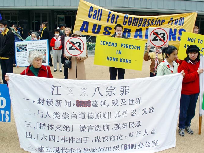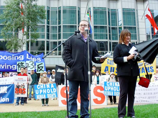 澳洲行业工会代表Matt Wright先生对中国的人权问题极为关注。他指出香港23条立法与联合国人权宣言第23条是截然对立的,切不可混为一谈。这样的极权法律一旦制定,无可避免将殃及工人们的权益。香港23条对上层人士,如政府官员和富人们不会有什么影响,只会歧视和迫害最无助的贫苦百姓。这条恶法是在前中国国家主席江泽民的压力下拟订的,其定义模糊,极易被篡改和利用。任何组织、团体都可能被冠上“危害国家安全”的罪名,即使他们的所为在任何一个民主国家看来都是很正常的。此法一旦通过,在公园里打坐或参加教堂活动都可能成为犯罪,香港居民的权利将由此受到严重侵害,他们将失去集会、结社和言论自由。而且像法轮大法及其他宗教团体和社会民主活动家都会失去他们应当享有的权益。该法的影响力还不仅仅是在香港,居住在其他国家的香港居民也可能遭到放逐、迫害和受到严惩。可以说,香港23条是严重违反人权的。这样的法律是中国大陆极权统治的典型产物,如今又把魔爪伸向香港。这是江泽民严重侵害人权的见证,也是它镇压、迫害法轮功的见证。它已作为千古罪人被法轮功学员推上公审台,以群体灭绝罪和反人类罪控诉。法轮功(又称法轮大法)是按照宇宙真、善、忍原则而修炼的一种高层次修炼方法,它以心性为基础,能带给修炼者祥和、宁静的心态。而中国政府只是以所谓的“危害国家安全”为由取缔它,成千上万的法轮功练习者被非法囚禁在劳改所、监狱和精神病院。上百人在监禁中被杀害。他们有人被鞭打、折磨,遭受种种酷刑;有人被注射了危险药物,导致严重的大脑损伤甚至死亡;更多人被迫与家人长期分离。然而中国政府却说,“我们没有迫害法轮功,我们对此不负责任。”然而无数受害者的血腥照片以及多人的证言证辞都证实了这场迫害,世界需要知道真相。如果23条通过,这些灾难将在中国大陆继续,并且将祸及香港。Wright先生还说,“我们听过霍华德、布什和布莱尔谈及伊拉克的现状以及伊拉克人民在极权政治下遭受的苦难。当然没有人会原谅伊拉克政权的残暴,但是奇怪的是,一谈到中国的人权状况时,他们却沉默了。他们不愿意危及贸易利益而为在中国受难的人们说话。他们的个人利益似乎比人们的生命和人权更加重要。在联邦下次大选时,我们需要考虑这一问题,我们所推选出的政府应该关心所有人的需要而不仅是富人们的需要。我们要团结起来,让更多的人参与进来,让所有的人知道真相。”