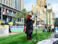 | 抗议人士手持横幅 | 大赦国际澳洲分部的Robyn Kilpatric女士 | 澳洲行业工会代表Matt Wright先生 |