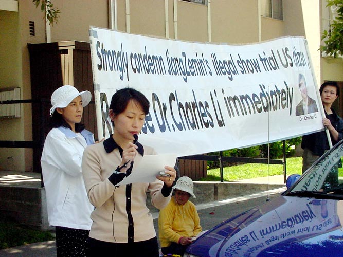 【明慧网2003年6月11日】今天(6月9日)下午12:30,几十名当地法轮功学员在中国驻洛杉矶总领事馆前举行了新闻发布会,公布被中国大陆当局非法判刑三年的美国公民、加州法轮功学员李祥春医生的近况,呼吁美国政府与社会大众伸出援手,早日把李祥春医生营救出狱,重获自由。学员同时介绍了控告前中共前国家主席江泽民“群体灭绝罪”一案的情况,并呼吁所有的中国人民都来支持这一诉讼案。