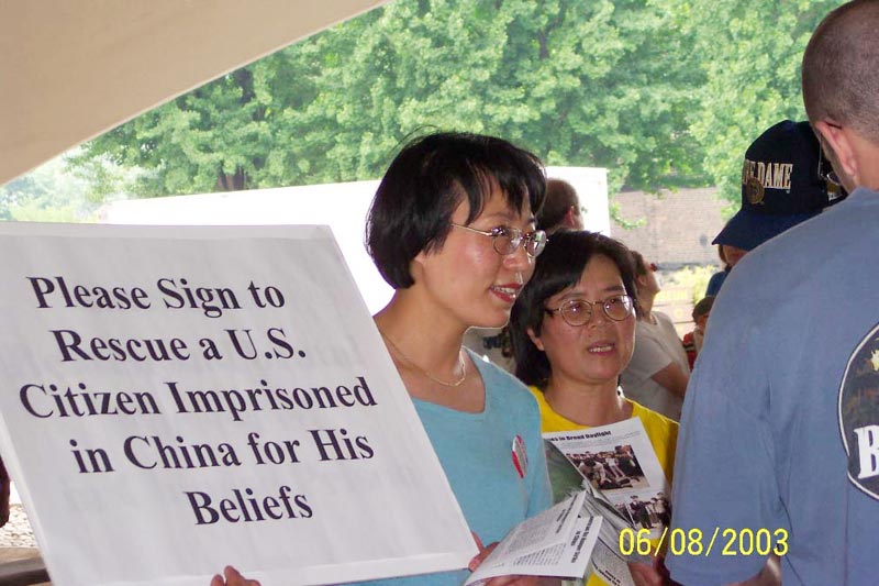 由于事先来不及申请到集体活动的许可证,学员们决定两三人一组分散在公园进出口的桥洞两头征签。其中一位学员举个小牌子以便让路人很快能明白我们在此的目的──“请为营救因信仰而被监禁在中国的美国公民而签字”,另一位学员发传单、、征集签名,还有一位学员打坐炼功进行功法演示。