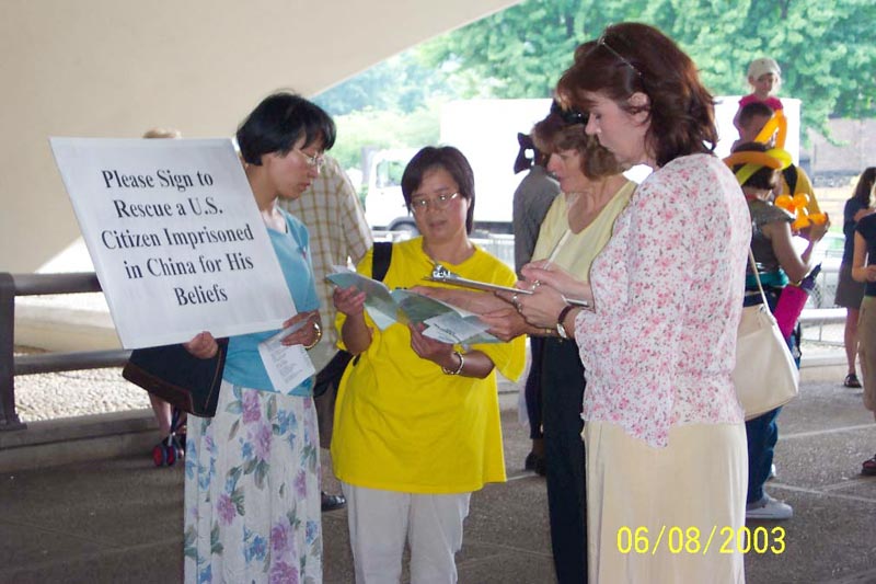 一个看起来是三代人的五口之家走过来了。学员问,“你们听说过法轮功吗?” 他们表示听说过,同时关心地问道,“好象还有个博士的太太因炼法轮功而被关押了?她怎么样了?” 学员解释说,“那是徐才录博士的妻子,她已经被放出来了。” “是吗?那太好了。”当他们明白我们这次是为营救另一位法轮功学员美国公民李祥春医生,全家都要求签名,连两个十几岁的孙子都慎重地签了名。尽管他们的女儿已经得到一份传单,年迈的老太太还希望再要一份真相传单。