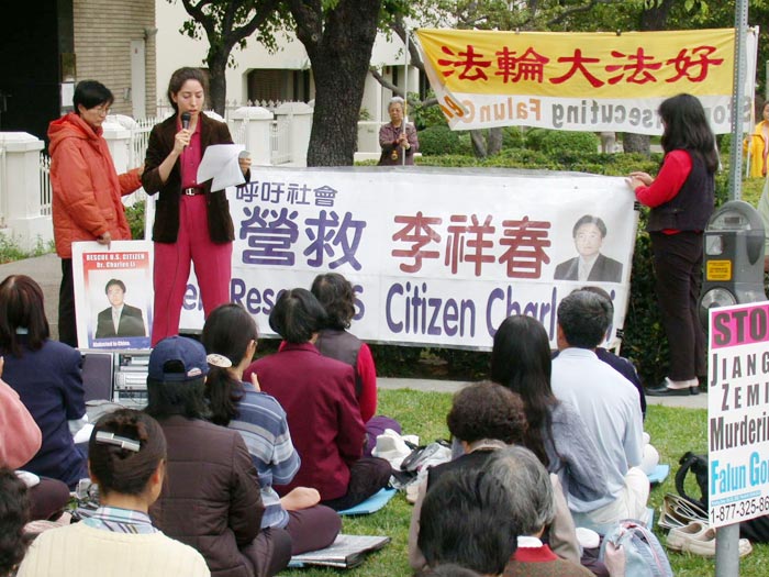 【明慧网2003年6月11日】今天(6月9日)下午12:30,几十名当地法轮功学员在中国驻洛杉矶总领事馆前举行了新闻发布会,公布被中国大陆当局非法判刑三年的美国公民、加州法轮功学员李祥春医生的近况,呼吁美国政府与社会大众伸出援手,早日把李祥春医生营救出狱,重获自由。学员同时介绍了控告前中共前国家主席江泽民“群体灭绝罪”一案的情况,并呼吁所有的中国人民都来支持这一诉讼案。