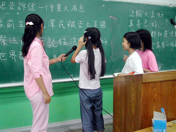 2003年6月8日台北明慧学校上课时,课堂中除了学法、教唱大法弟子创作的歌曲以及修炼故事分享外,这次还特别安排了小弟子打电话讲清真相的活动。