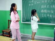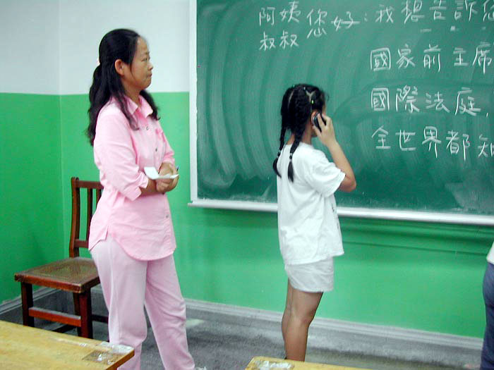 学法之后,辅导员把简单的讲稿写在黑板上,由辅导员拨通大陆的电话后,首先表明「有位台湾的小朋友想向您说几句真心话」,然后把电话交给小弟子看着讲稿向大陆可贵的中国人讲清真相。小弟子们很踊跃地排队等候,丝毫没有所谓的怕心。一位小弟子先前曾打电话到大陆,被对方的一阵破口大骂声给吓哭了,可是今天他似乎没有任何胆怯、不安的心,还很积极地排第一位先行「示范」,也鼓舞了其他小弟子打电话讲清真相。在打电话讲清真相中小弟子纯净的心灵表露无遗!