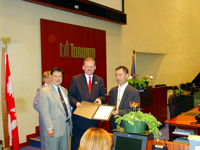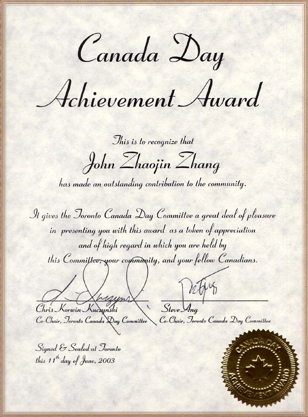 据多伦多市政府庆祝加拿大国庆委员会的共同主席之一、当地侨领洪世忠先生介绍,在过去的二十年里,这个委员会每年都要给对国家、社区做出杰出贡献的人士颁奖。候选人都有5年以上的义工经验、经社区推举、由委员会审查后选拔出来。今年得奖者中,除法轮功学员张照进先生外,华人有十多名,包括前香港中文大学新闻系主任,还有一名从大陆移居加拿大20多年、一直致力于把中医介绍给西方社会的中医师。
