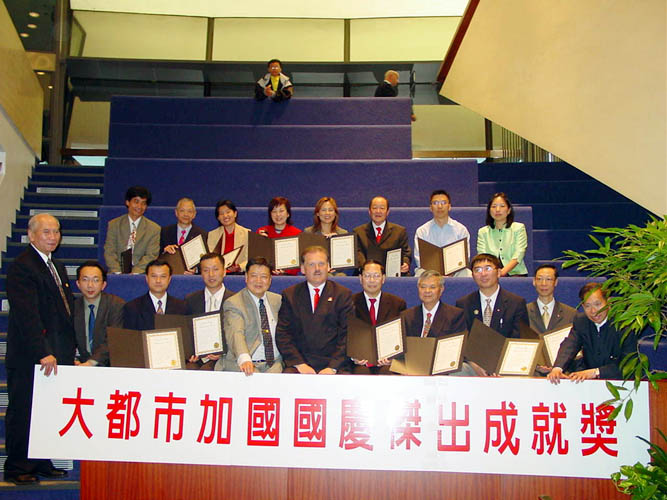 | 张照进先生(右)与多伦多市国庆委员会主席考文-库任斯基先生和洪世忠先生合影 | 获奖的华人与共同主席考文-库任斯基先生(前排左5),洪世忠先生(前排左6)合影。 |