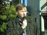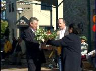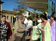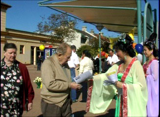| 联邦议员、就业和培训影子部长Anthony Albanese 先生发表演说 | 马力维克市的法轮功学员Myrna Mack女士给Stephen Sim先生赠送鲜花 |