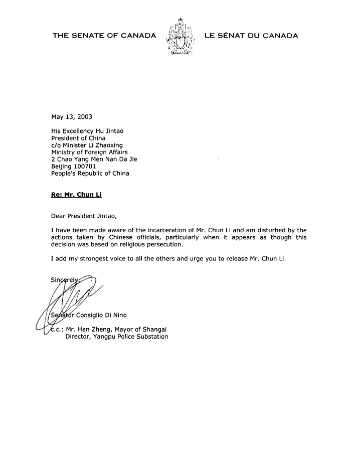 加参议员致信胡锦涛 强烈要求释放李进宇的弟弟李纯