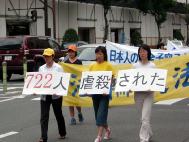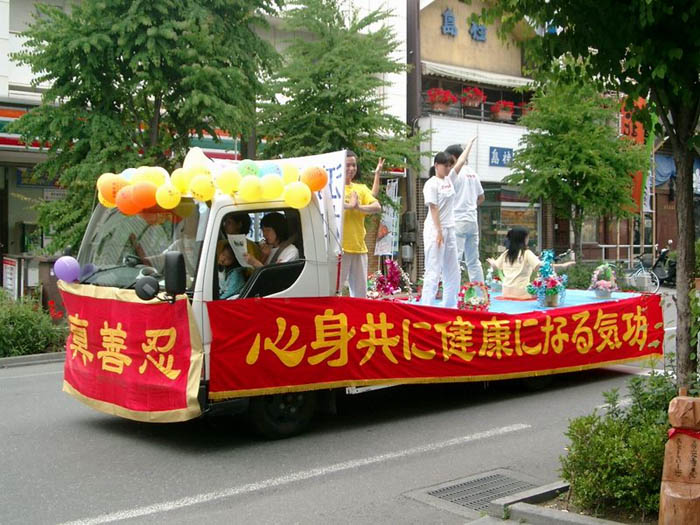 上午,学员们一起静心地集体发正念,炼功,学法和交流。下午1:30,游行队伍从市中心的繁华地段的南千岁公园出发。路上的行人纷纷地接过真相资料,两千份真相材料在近2小时的游行过程中,几乎全部发完。在整个游行过程中,跟随游行队伍负责维持交通秩序的警察们,也是始终面带笑容。真是“佛光普照、礼义圆明”(《洪吟》容法)。