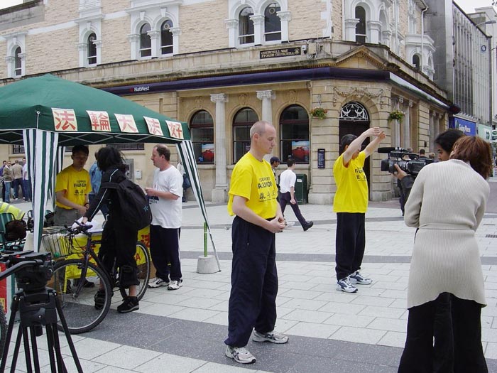 洪法活动中还有个小插曲:两位卡迪夫大学新闻系的同学途经展位,对法轮大法产生很大的兴趣,她们在征询我们同意后,搬来了摄影及录音器材,开始为本次活动拍摄专辑片以作为学期论文。在拍摄完中西方学员的功法示范及征集签名活动后,她们又对我们几位学员及前来签名的路人进行专访。我们详尽地为她们介绍了法轮大法的特点、益处、目前在中国的迫害,以及大法学员在近年来向全世界人民讲清真相所获得的支持与成果。由于这个专辑片的拍摄,我们的展位很受路人的注目。