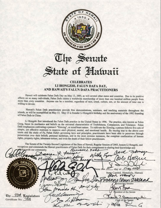 夏威夷州参议院第22届议会在2003年例会上嘉奖李洪志先生,并鼓励和赞扬夏威夷的法轮大法学员致力与社区的人们共同分享他们的认识和功法。