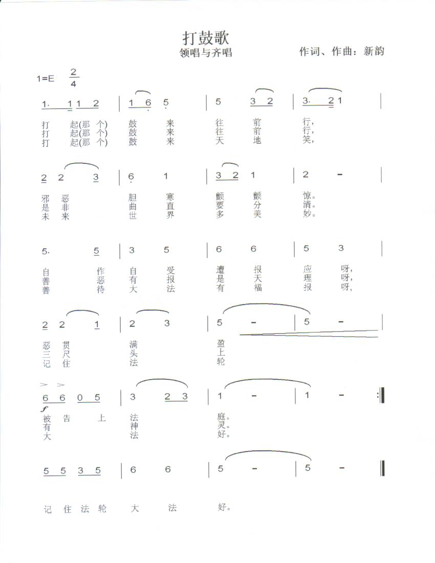打起(那个)鼓来往前行,邪恶胆寒颤颤惊,自作自受遭报应,恶贯满盈被告上法庭。打起(那个)鼓来往前行,是非曲直要分清,善恶有报是天理,三尺头上有神灵。打起(那个)鼓来天地笑,未来世界多美妙,善待大法有福报,记住法轮大法好。
