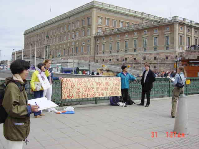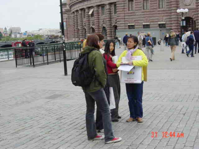 【明慧网2003年6月2日】为呼吁全社会关注仍在泰国被无理关押的法轮功学员普瑞佑·斯文森女士,瑞典斯德哥尔摩大法弟子连续开展征签活动。并以此活动揭露江氏集团