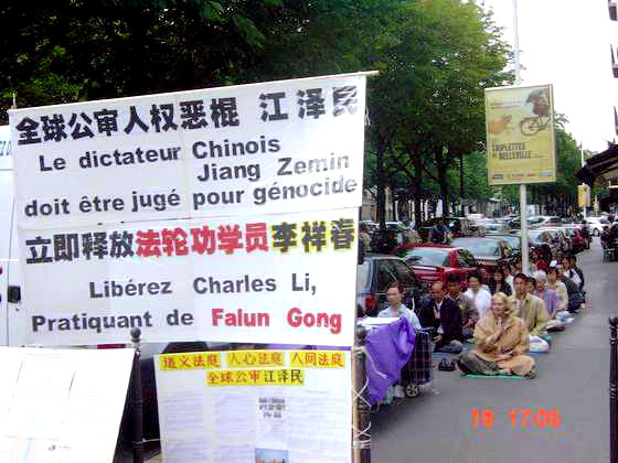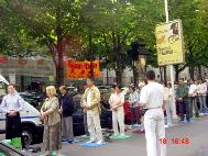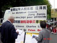学员心里笑了:一定是这个标语牌打到了邪恶的神经要害;怎么使馆的人不敢要求拿掉那些有关法轮大法洪传世界、法轮功学员在中国大陆遭虐杀、酷刑的图板呢?是不是意味着他们承认这一切呢?