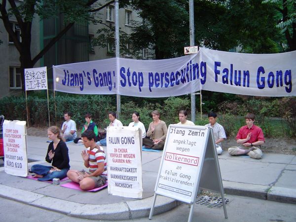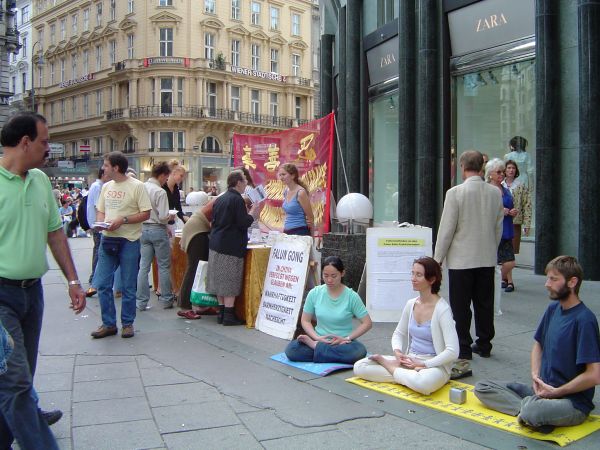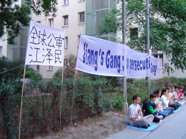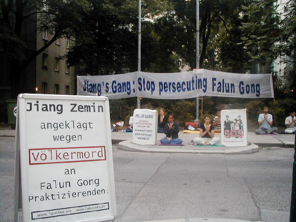【明慧网2003年6月22日】奥地利大法弟子于2003年6月19至22日在维也纳举行了一系列活动支持公审江××。我们在中使馆前炼功、发正念,并在市中心向人们揭露江犯下的群体灭绝的罪行。