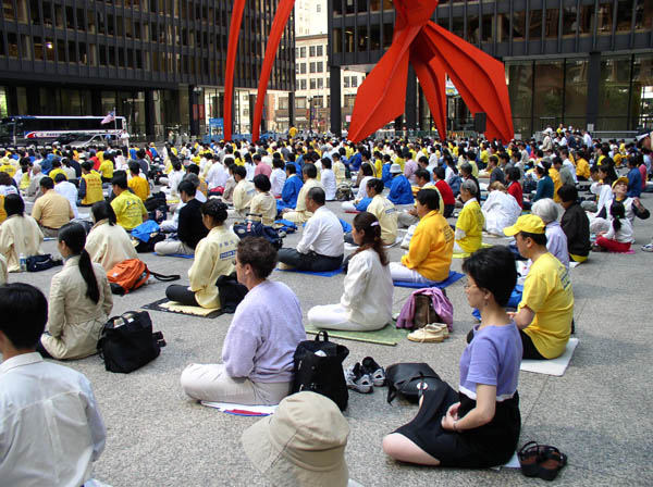 今天的芝加哥,晴空万里,和风习习,艳阳高照。1500多名法轮功学员整齐地在联邦广场排成方阵,向公众演示功法并发正念,场面蔚为壮观。联邦广场西侧玻璃建筑前竖立起一个长达50多米的中英文巨型横幅,上书赫然醒目的大字“天理昭昭,全球公审江泽民”等。广场四周的学员们打起了“法轮大法好”、“停止迫害”、“营救亲人”等横幅,引来许多路人驻足观看。