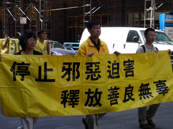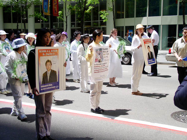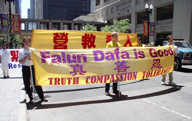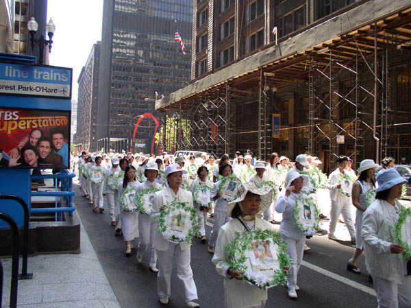 新闻发布会后,1500余名法轮功学员从联邦广场出发,开始了在芝加哥市中心的大游行。三位西人学员打着“法轮大法好”、“真善忍”的横幅走在队伍的最前列,紧随其后的紧急营救亲人的展板和横幅,接下来是150名身着白衣的女学员手捧着在中国被迫害致死的法轮功学员的照片,在悲壮的大法音乐《普度》、《济世》声中,场面庄严、肃穆、感人。