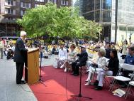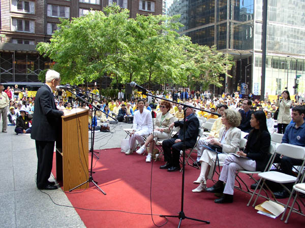 上午10点45分,新闻发布会开始,主持人宣读了多封芝加哥市和伊利诺伊州政要发来的支持信和对美中法会的贺信。芝加哥市长Richard Daley在发来的贺信中高度评价了“真善忍”准则及法轮功为人类身心健康所作出的贡献,并预祝法会圆满成功。伊州国会参议员Richard Durbin,国会众议员Lane Evans,国会众议员Jan Schakowsky 也都送来对法会的贺信,并在信中表达了对法轮功学员信仰自由的支持和对这场残酷迫害的强烈谴责。还有十数位芝加哥市市议员,伊州州参议员,州众议员也发来贺信。伊州Peoria市市长宣布今年6月为该市的法轮大法月,Rock Island市宣布6月16日至22日为该市的法轮大法周。特别值得一提的是伊州Dixon市市长James Burke先生还专程与夫人驱车两个多小时从Dixon 市赶来参加今天的活动,并发表了感人至深的讲话,他手里拿着《独立宣言》说,“自由、平等、民主是美国的立国之本,信仰自由也是普世认可的基本人权,我为法轮功学员的自由而呼吁。”与伊利诺伊州相邻的密苏里州的圣路易市市长,市议会议长,堪萨斯市市长,及几位密州州众议员也发来了祝贺法会的信件和决议案。密州国会众议员Lacy Clay是签署敦促法庭继续诉江案的“法庭之友”信件中39位国会众议员之一,他也特地发来信函来表达对这一历史审判的强烈支持。