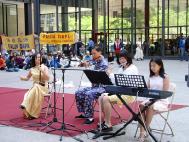 两台演出节目丰富多彩,参加演出的学员来自世界各地。从清新活泼的儿童歌舞,悠扬的中国民族乐器演奏,到西人学员演唱的中文大法歌曲和美不胜收的舞蹈,吸引许多行人纷纷驻足观看,博得全场观众的阵阵掌声。