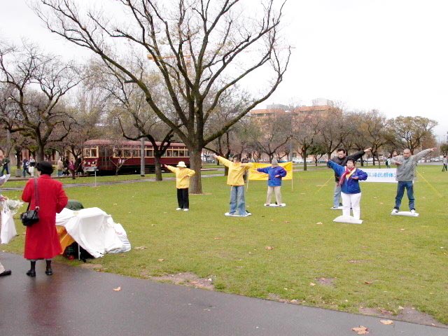 整个活动中,阴风阵阵,阴雨濛濛,学员们始终安静祥和地坐在湿漉漉的草地上,不停地发正念和展示功法,过往的行人都为之动容,有的主动在征签表上签名,有的双手合十连声向学员道谢。一位台湾人感叹地说:“这么大的风,这么大的雨,你们都不动,真伟大!太了不起了!我回台湾就买一本《转法轮》。”